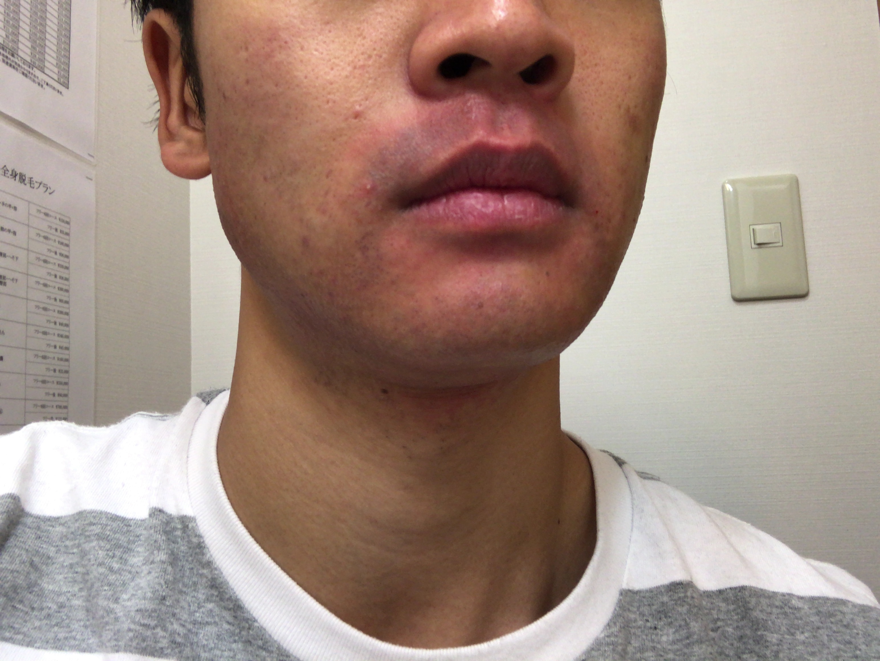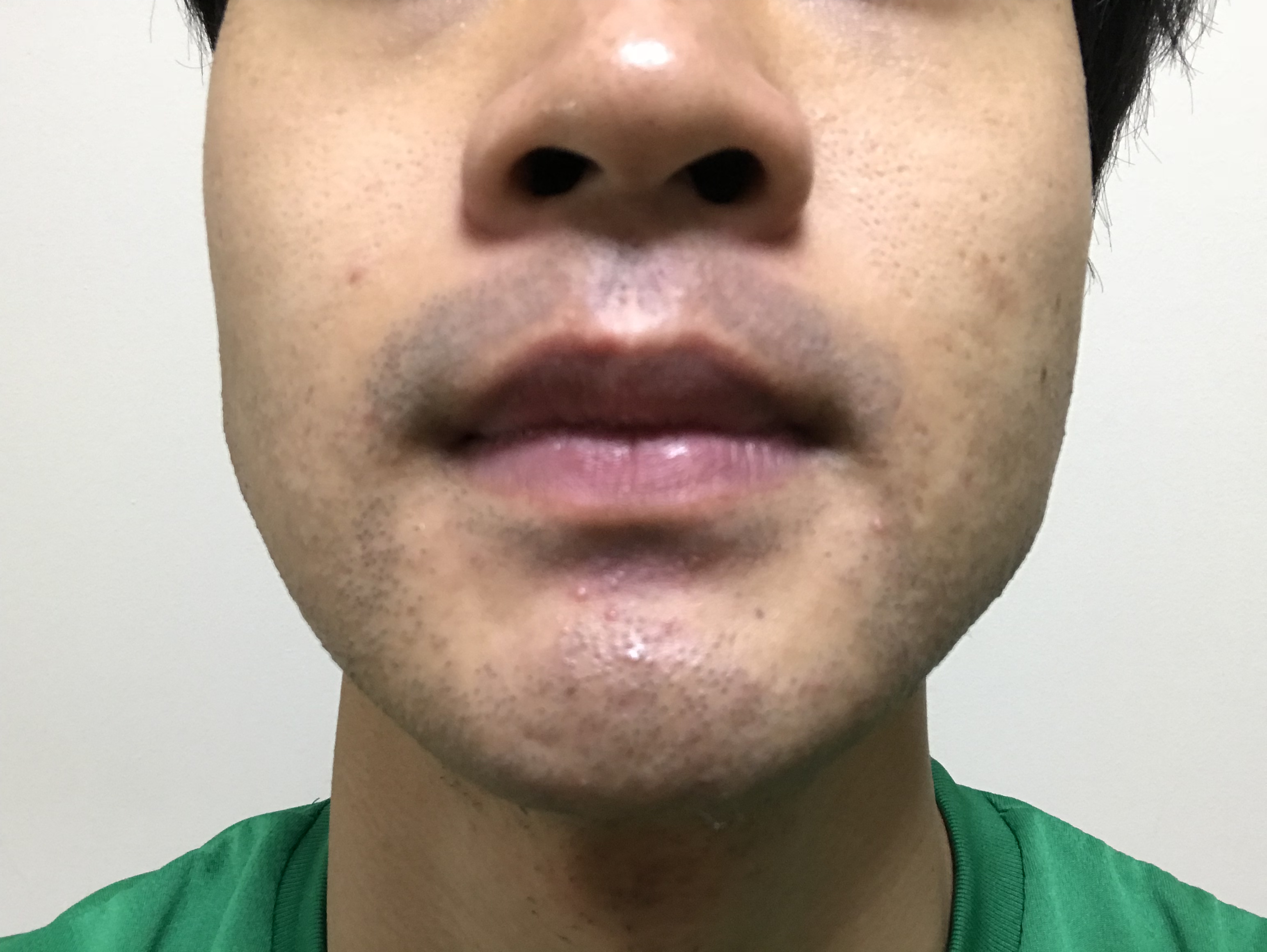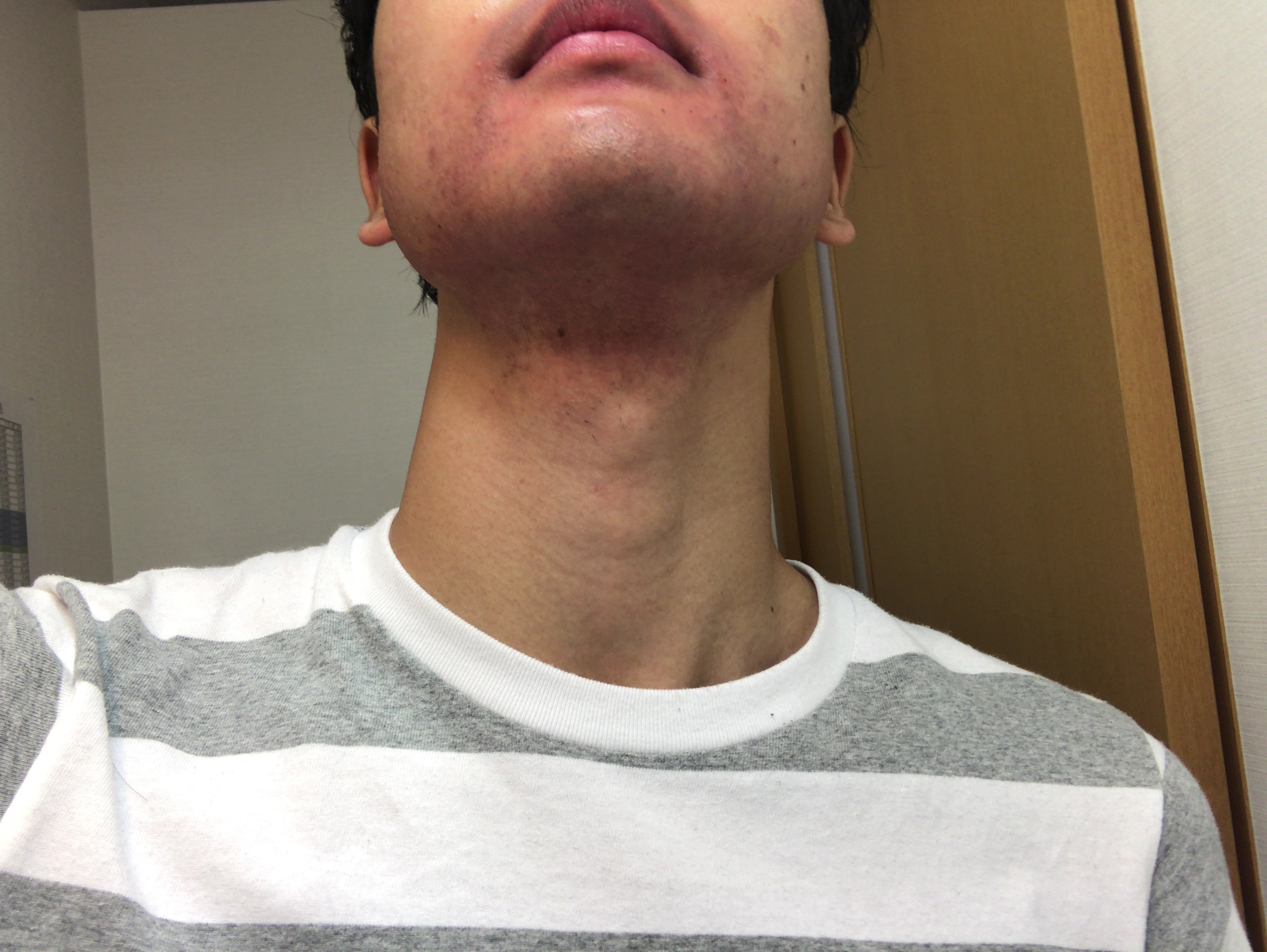 写真だと分かりづらいですが、あごの下に毛嚢炎(もうのうえん)というニキビのようなものが出来ていました。